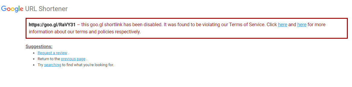 After shortening the domain name, just open up the shorten link and if the domain name will be penalized by Google, you will get a message like this: